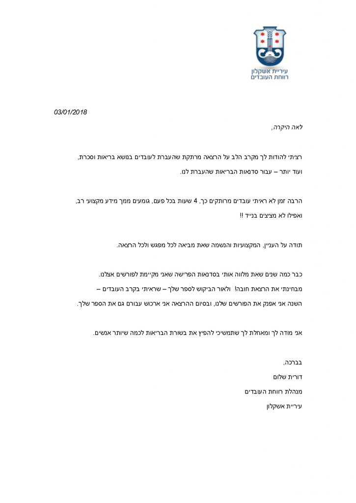 רציתי להודות לך מקרב הלב על הרצאה מרתקת שהעברת לעובדים בנושא בריאות וסכרת,