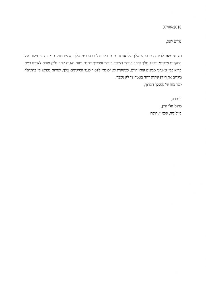 נהניתי מאד להשתתף בסדנא שלך על אורח חיים בריא. כל ההסברים שלך מדעיים ומגובים במראי מקום של מחקרים מדעיים. הידע שלך נרחב ביותר ועדכני ביותר ומפריך הרבה דעות ישנות יותר ולכן תורם לאורח חיים בריא כפי שאנחנו מבינים אותו היום. ככימאית לא יכולתי לעמוד כנגד הטיעונים שלך, למרות שנראו לי בהתחלה נוגדים את הידע שהיה רווח בשטח עד לא מכבר.